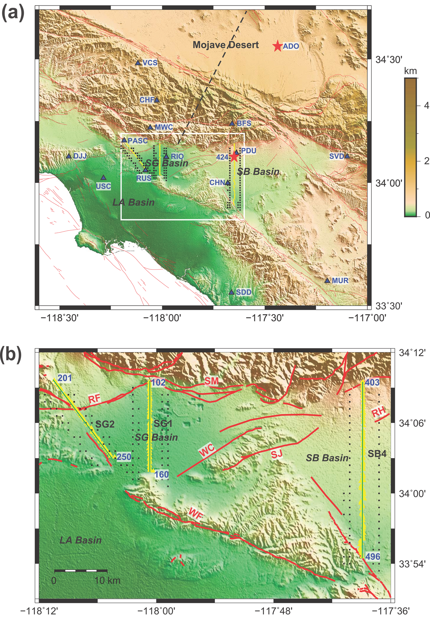 FIG. 1 Map of the greater Los Angeles area showing the locations of the SG1, SG2 and SB4 nodal deployments in the San Gabriel and San Bernardino basins (small triangles) and the Southern California Seismic Network broadband stations (large triangles