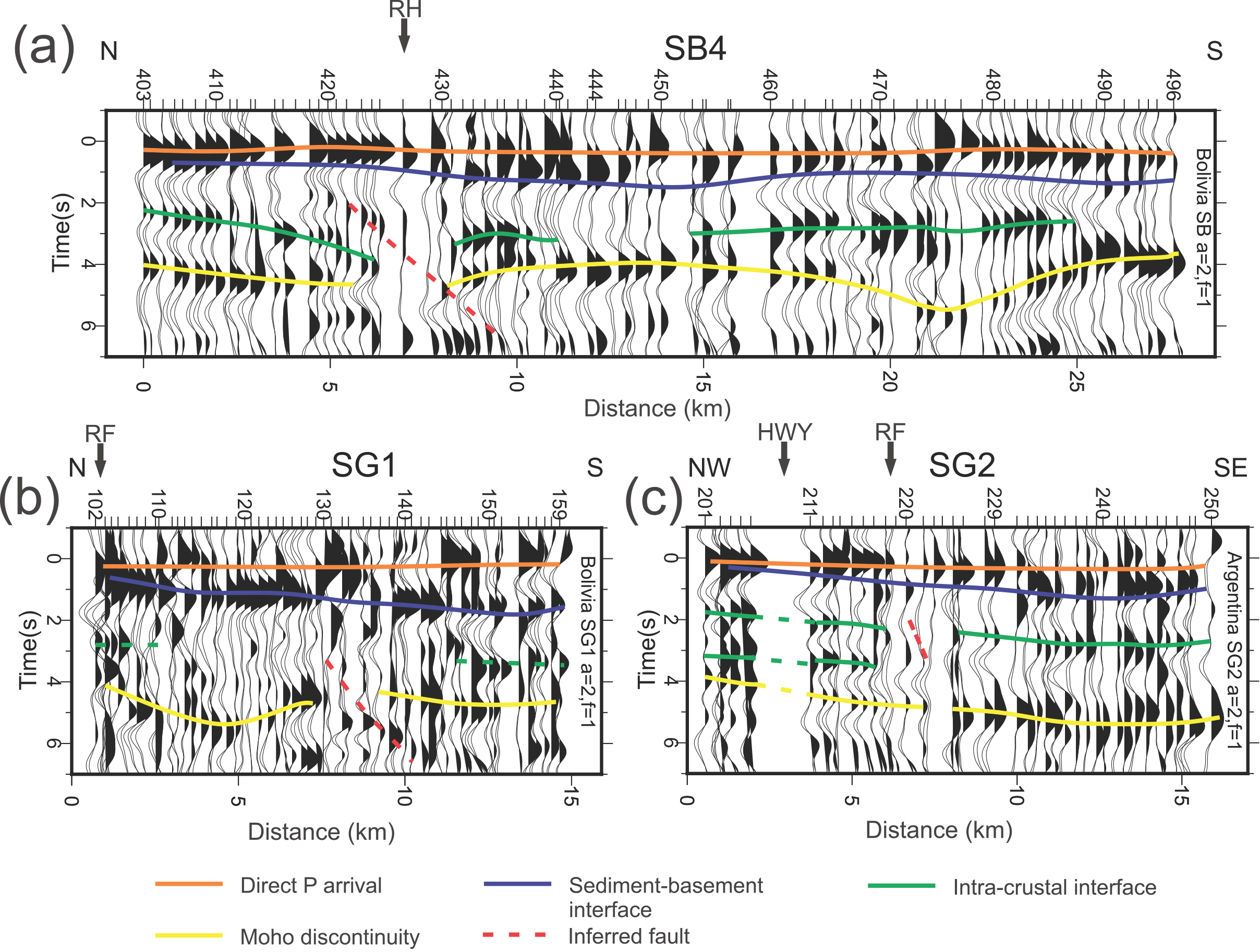 (a) the SB4, (b) the SG1, and (c) the SG2 lines. Profile locations are indicated by thin lines in Figure 1. RF, Raymond fault; RH, Red Hill–Etiwanda Avenue fault; HWY, Highway.