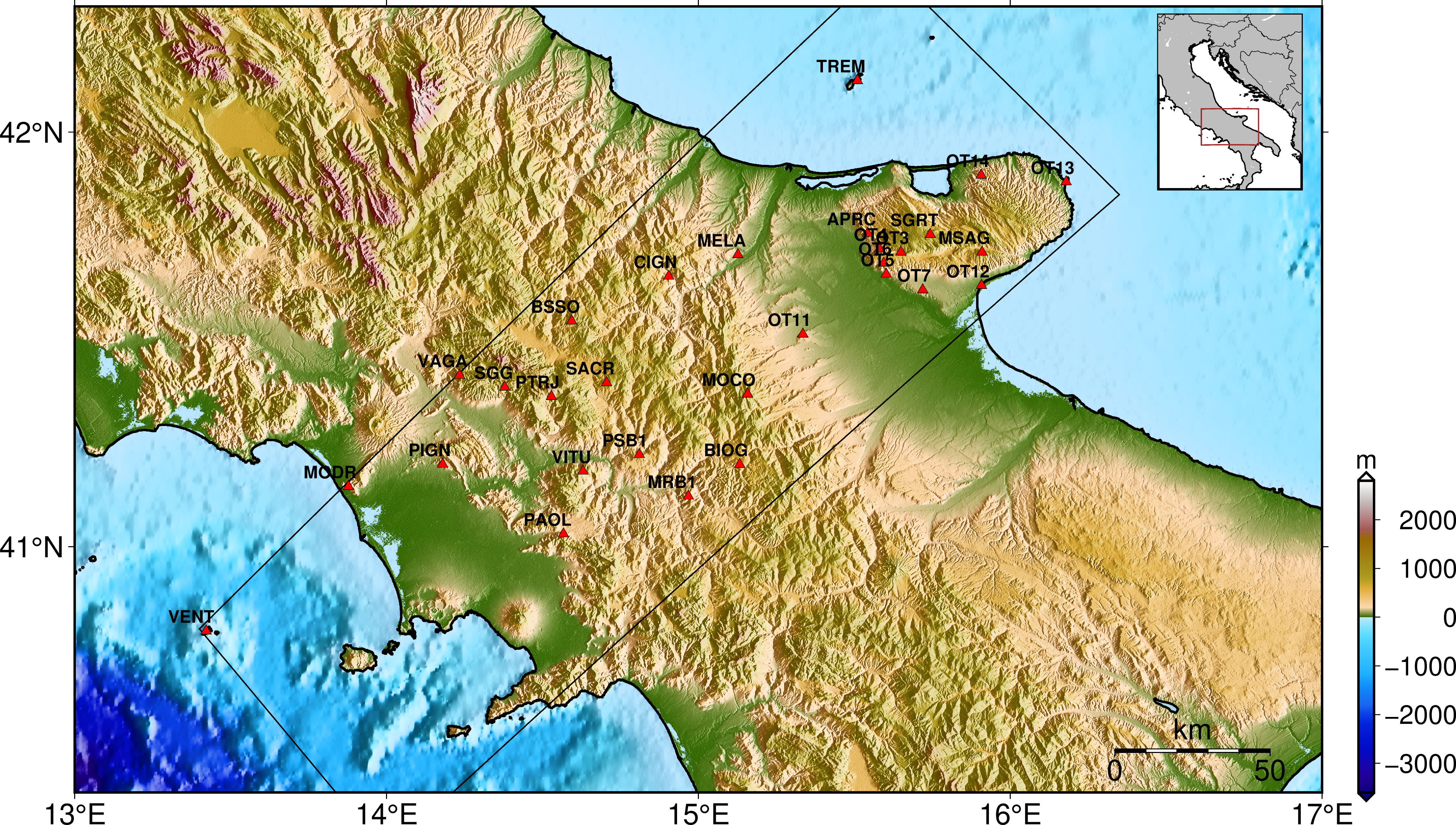 FIG. 1 Map showing the study area in the Southern Apennines and our initial station selection for the receiver function study.