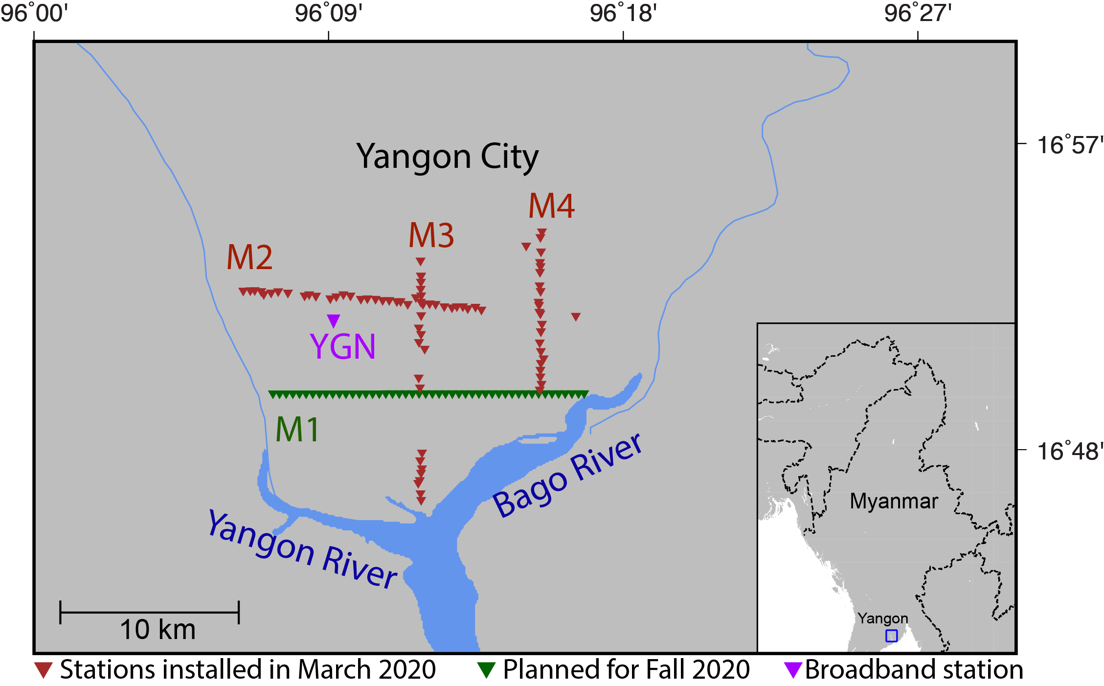 The seismic hazard beneath Yangon, the city with the largest population in Myanmar (~7.3 million) is largely unknown. Our project is focused on working with the local community to characterize the subsurface beneath Yangon city, which is located close to the Sagaing fault, a continental scale transform fault like the San Andreas fault that crosses through major population centers in Myanmar. We planned to deploy four seismic profiles in the city of Yangon (Figure 1) as this would be the most impactful location to collect seismic data and constrain basin amplification effects.