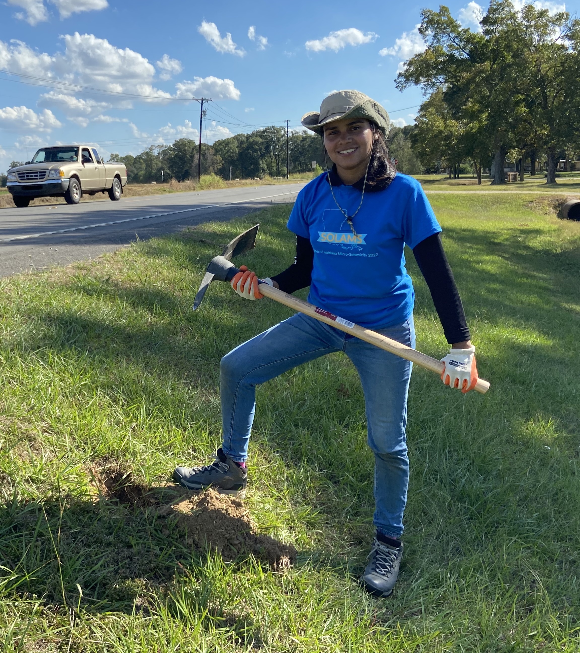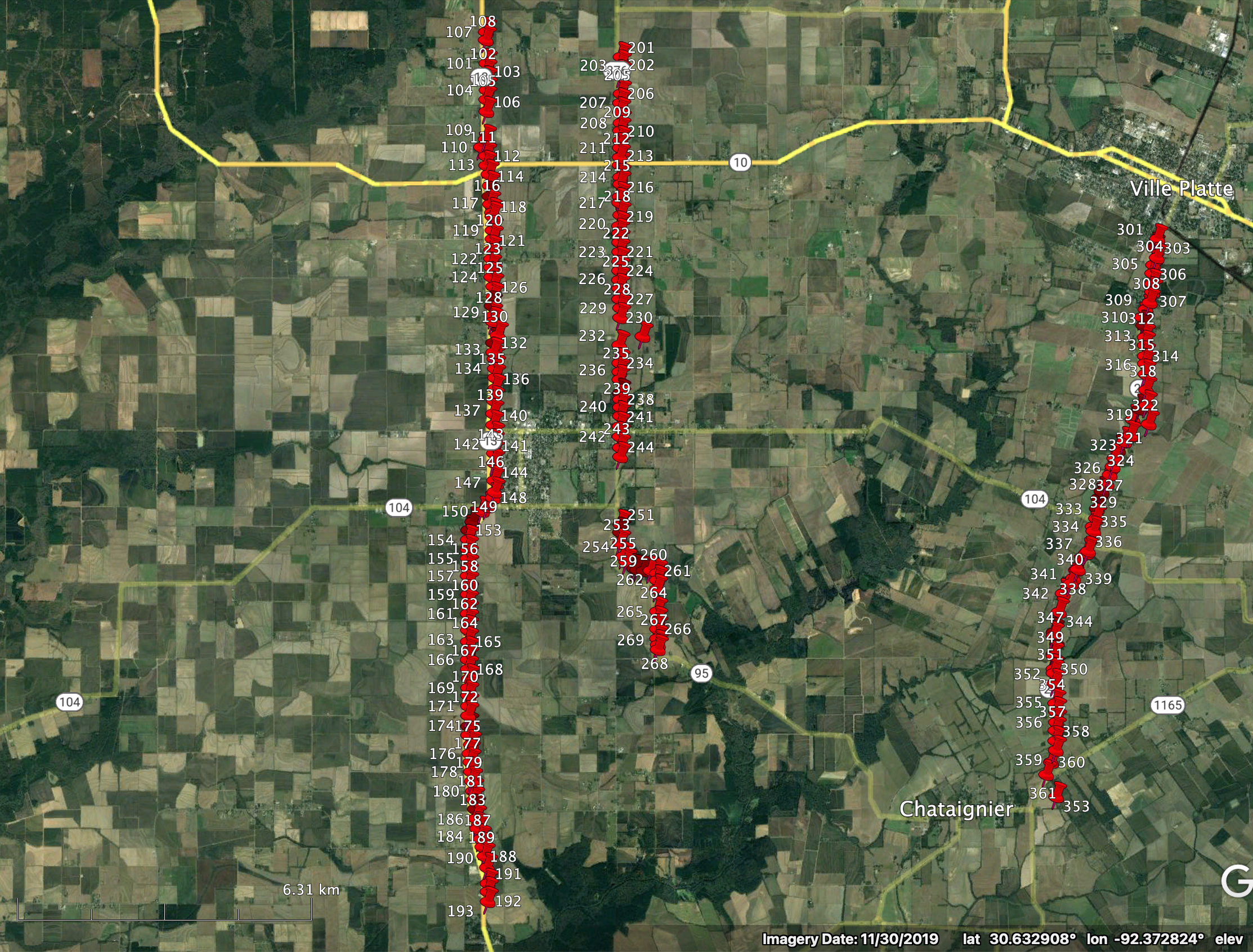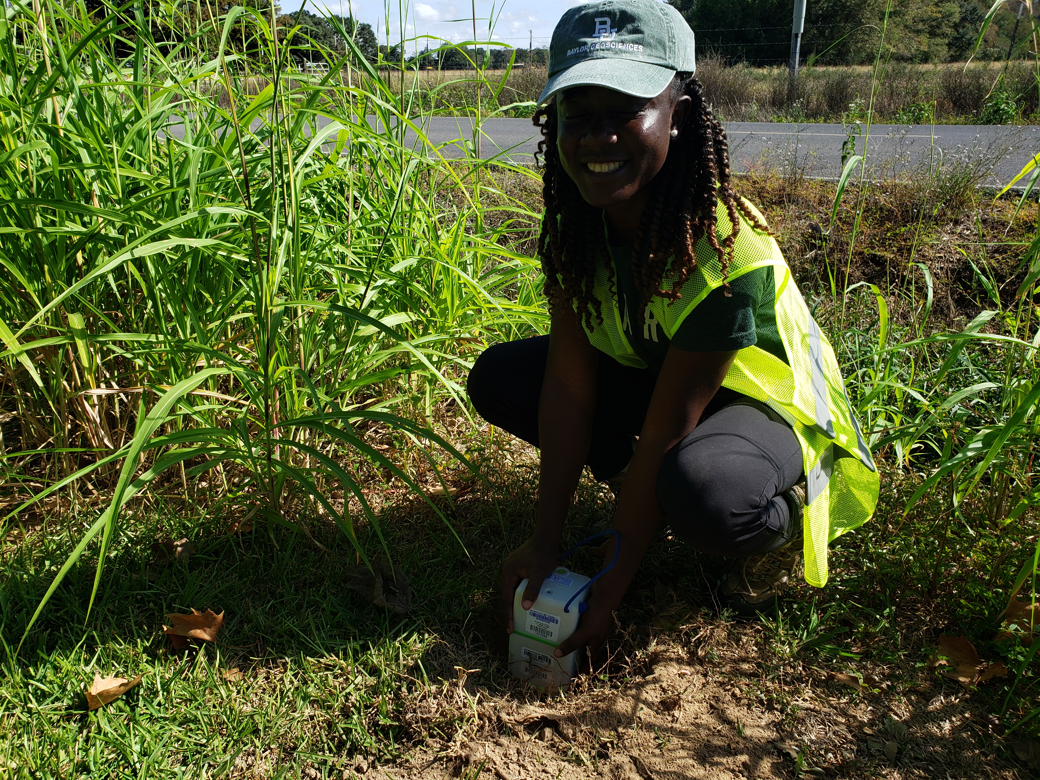 Twenty-seven volunteers from Southern University Baton Rouge, Baylor University, University of Louisiana at Lafayette, University of Southern Mississippi, LSU, and the Louisiana Department of Natural Resources have setup the largest array to date in this area. FIG. 2 Michael, Sachin, Patricia, Sandra, Hunter and Ben deploying stations on Line 2 near Mamou, Louisiana. FIG. 3 Ritu installing a node in Baton Rouge. FIG. 4 Aicha installing a node at the side of the road in Mamou. FIG. 6 Sandra installing station 268 in Mamou. FIG. 7 Kwabena helping Delton in Baton Rouge.