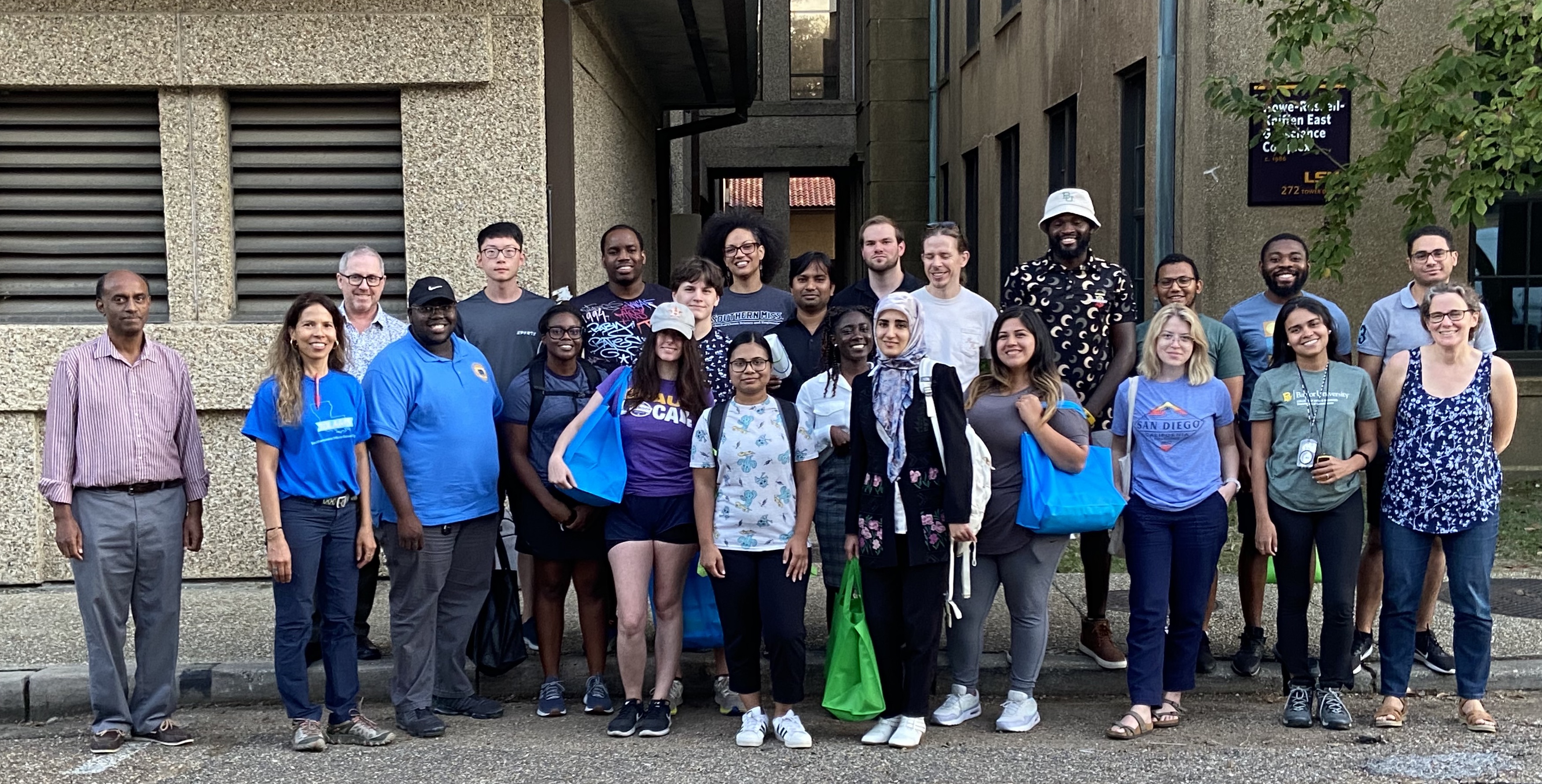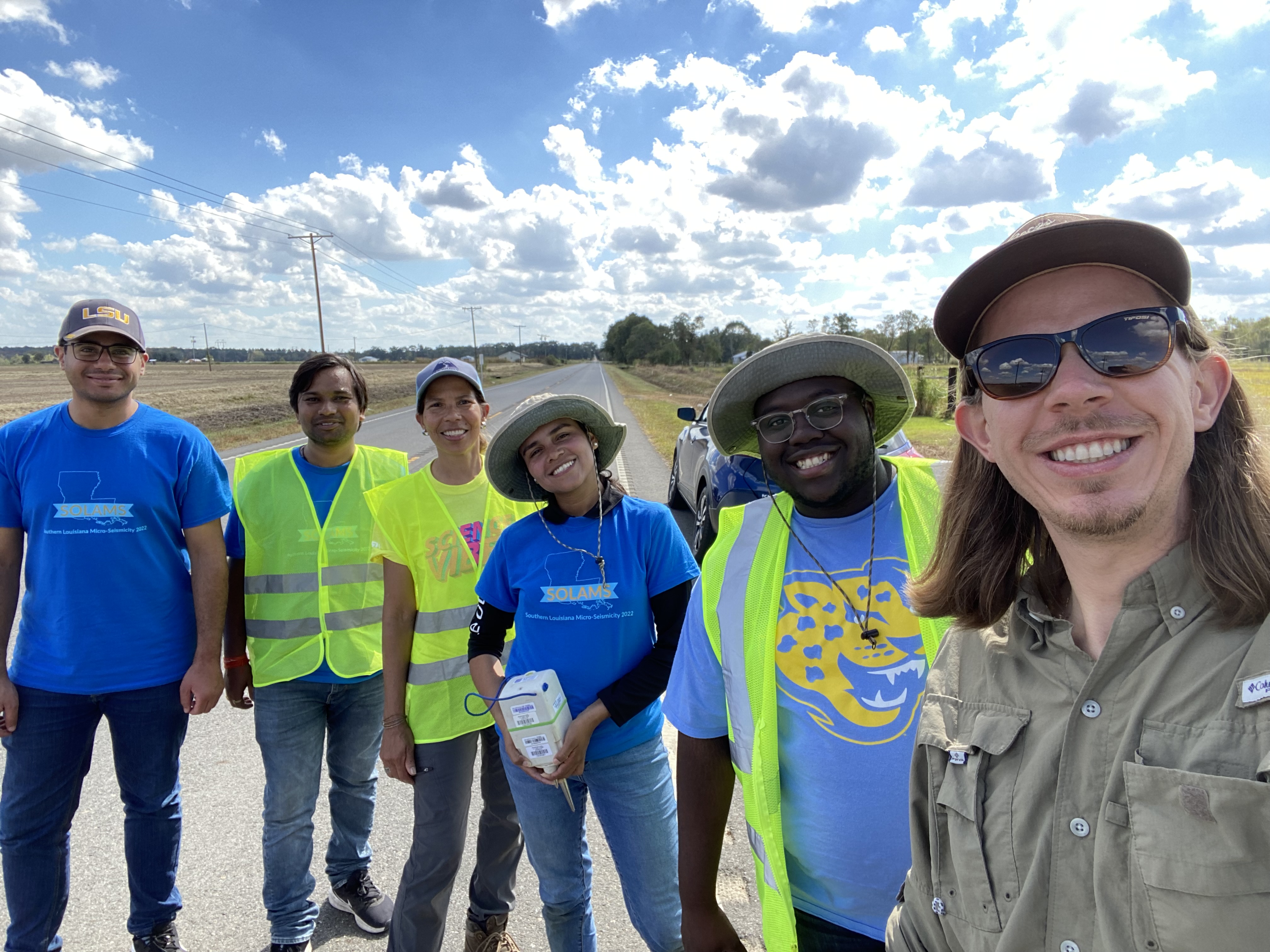 The SOLAMS group installed 378 “nodes” in Southern Louisiana during the weekend of October 15-16, 2022. In the following week, the group completed the installation with 432 nodes in the ground. Nodes are modern geophysical instruments capable of measuring ground motions that are too small to be felt. The recordings will be used to better understand features below the Earth's surface, and the influence of faults on subsidence and groundwater flow in the region. The SOLAMS project consists of 5 arrays of nodes installed in the Baton Rouge and Mamou areas. It is a true experiment because we have not collected data at this large scale (and with so many instruments) in this region before. Maps with our stations are shown at the bottom of this page. FIG. 1 The SOLAMS installation team outside the Geoscience Complex at LSU. Photo taken: Friday, Oct 14, 2022.Who We Are