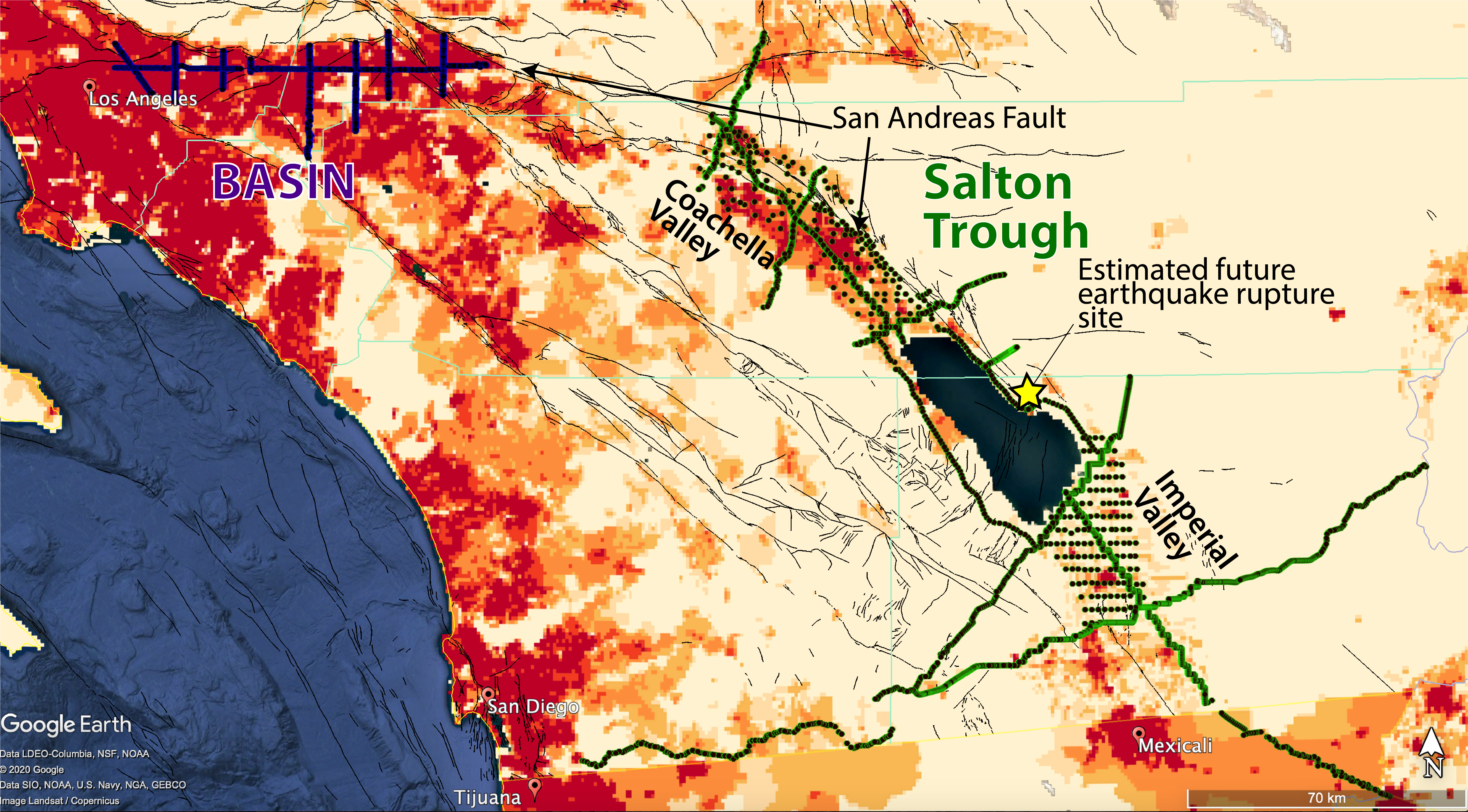 Population density map of Southern California (reds are higher population densities) showing the Salton Seismic Imaging Project receiver locations (green dots). The location of the passive source BASIN survey is also shown for reference. Black lines are faults.