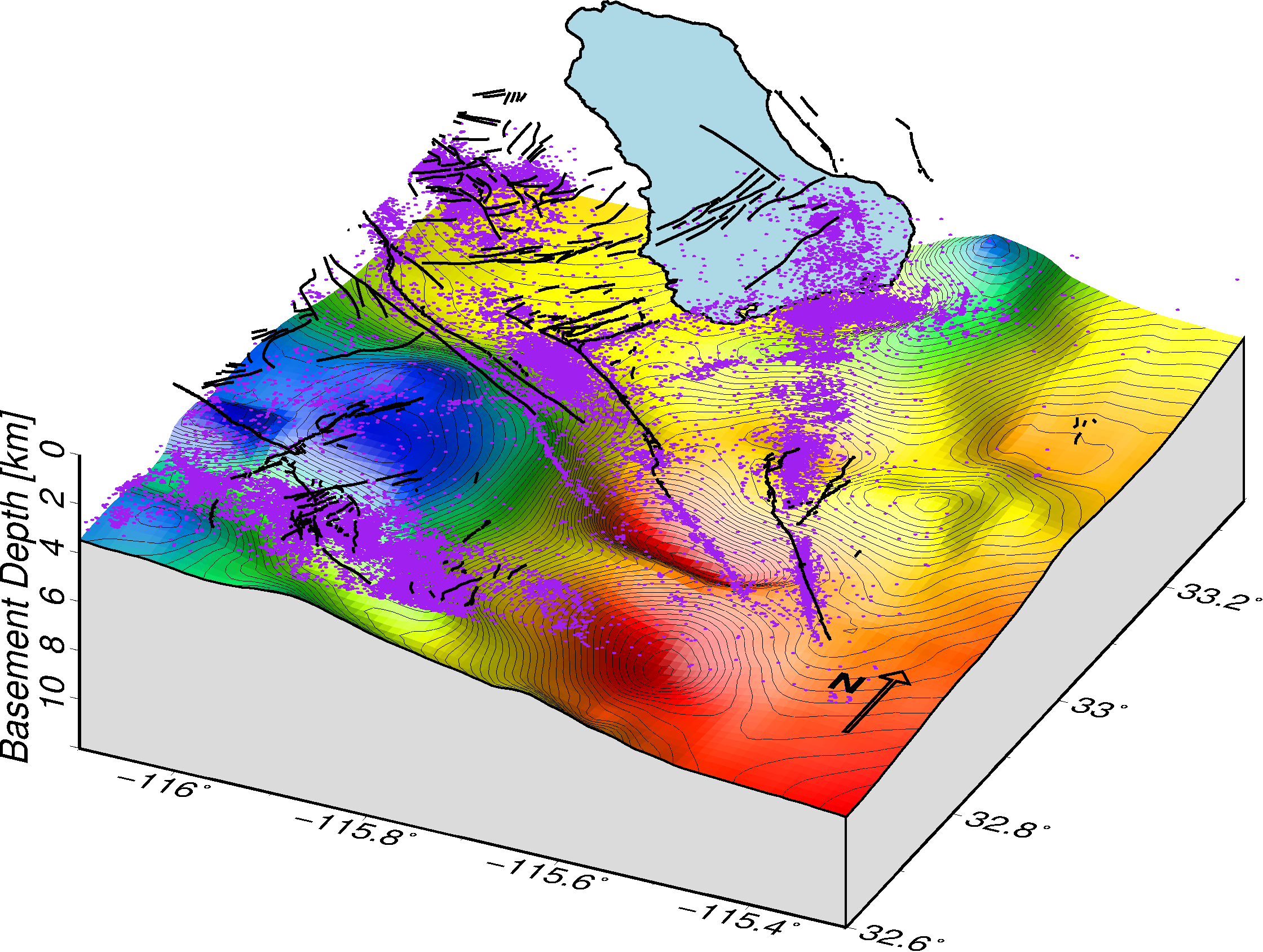 II. Improved 3-D P-wave velocity model for the southern Salton TroughPerspective view of estimated basement depths (hot colors show deeper basement) in the Imperial Valley at the southern end of the San Andreas Fault system overlain by faults and seismicity. Blue-filled area is the Salton Sea.